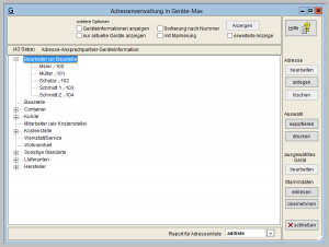 In Geräte-Max werden an verschiedenen Stellen unterschiedliche Adressen benutzt (Kunden, Lieferanten, Mitarbeiter, Hersteller, Kostenstellen, usw.). Für die Geräteverwaltung werden häufig nur Nummer und zugehörige Bezeichnung benötigt. Optional wird hier eine erweiterte Adressverwaltung zur Verfügung gestellt, um zu allen Arten von Adressen auch einen erweiterten Stammsatz zu verwalten.