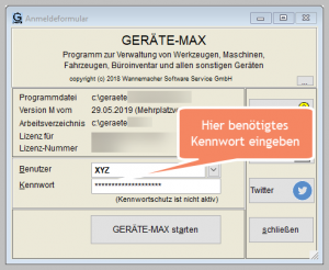 Wenn der Kennwortschutz noch nicht aktiv ist, muss das Programm mit dem GENERALKENNWORT gestartet werden, andernfalls mit einer Benutzer-Kennwort-Kombination mit höchster Berechtigung.
