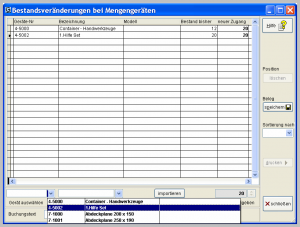 Für Mengengeräte (und Verbrauchsartikel) wird der Anfangsbestand im Gerätestamm eingetragen. Wenn die Bestände durch Zukäufe ergänzt werden, kann es sinnvoller sein, die Zugänge mit dieser Funktion in einem Durchgang, z.B. direkt von einem Lieferschein, zu erfassen.