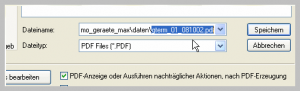 | Ein sinnvoller Dateiname für das zu erzeugende Dokument wird immer im Zwischenspeicher bereitgestellt und kann mit STRG-V abgerufen werden. Ein Ordner für die Ablage kann in der Datei GERAETE.INI mit dem Eintrag DRUCKVERZEICHNIS = xxxxx festgelegt werden (xxxx z.B. = c:\pdf\ ) |