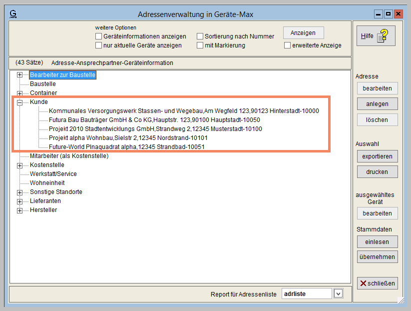 | nur aktuelle Geräte | Die Anzeige beschränkt sich auf die zur Zeit aktuellen Adressen |