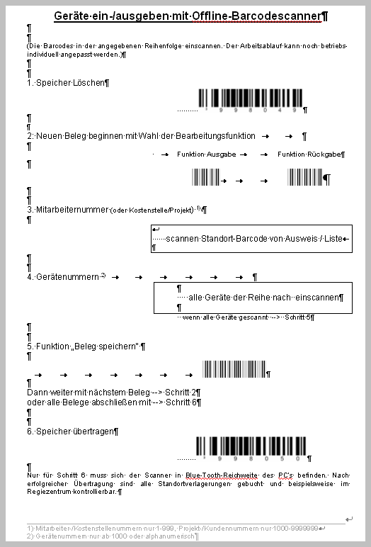 Voraussetzung ist, dass alle Geräte mit Barcodes ausgestattet sind und die Nummern der Standorte/Mitarbeiter ebenfalls als Barcode vorliegen.