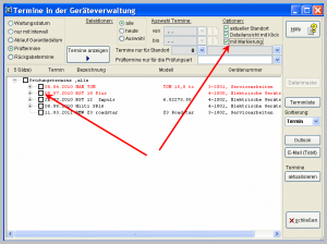 Das Markierungskästchen ermöglicht die Auswahl einzelner Termine, z.B. für den Outlook-Export und für eine Aktualisierung der Wartungstermine / Prüftermine entsprechend hinterlegter Wartungsintervalle.