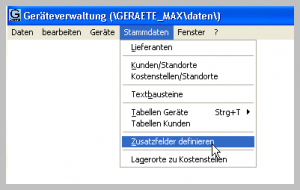Zu einem Gerätestamm können 17 Zusatzfelder belegt werden. Diese Felder können individuell verwendet werden. Die Beschriftung der Felder und die Auswahlmöglichkeiten bei den Combo-Boxen (= Felder, für die eine Auswahl aus vorbelegten Eintragungen erfolgen kann) können hier festgelegt werden.