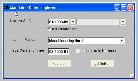 Nach Auswahl des zu kopierenden Geräts ist der neue Mandant und gegebenenfalls eine abweichende Gerätenummer einzugeben.