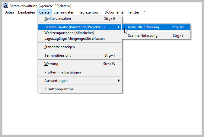 | Werkzeugausgabe an Mitarbeiter | Menü Geräte – Werkzeugausgabe |