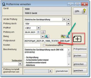 Unter BELEG und PROTOKOLL können auch Links auf Dateien angegeben werden (z.B. eingescannter Prüfbericht). Mit dem Lupen-Button kann dann der Beleg wieder angezeigt werden.