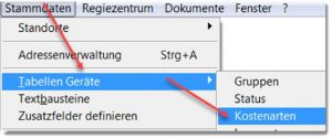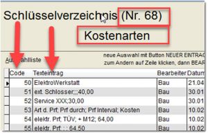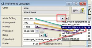 - Unter Stammdaten —> Tabellen Geräte —> Kostenarten können mit dem CODE >=50 folgende Werte (TEXTFELDER) für die Prüftermine vorbelegt werden.