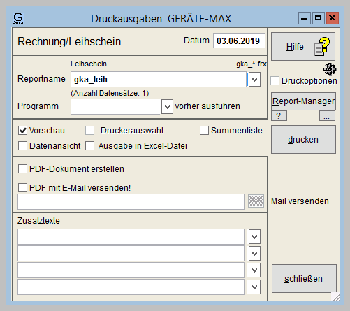 In der Druckauswahlmaske, die vor jedem Ausdruck angezeigt wird, kann der Report-Manager speziell für diesen Report aufgerufen werden (wenn man das Programm mit Manager-Berechtigung gestartet hat!)