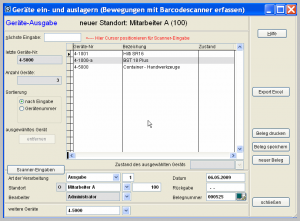 Menü GERÄTE – GERÄTEAUSGABE (BAUSTELLEN / GERÄTE) oder alternativ als eigenständiges Programm SCANNER.EXE aufgerufen.