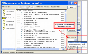 Besondere Programmfunktionen sind für die Gerätegruppen vorgesehen. Hier können wahlweise die Gruppen der Baugeräteliste (BGL) 2007 vorbelegt werden. Zur Wahl stehen die Hauptgruppen A – X oder Haupt- und Untergruppen A.0 – X.5 .