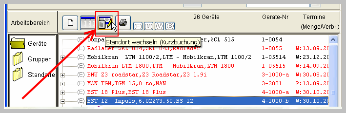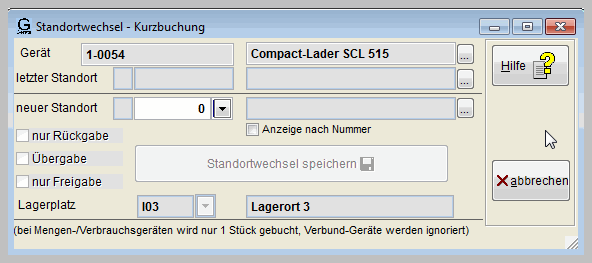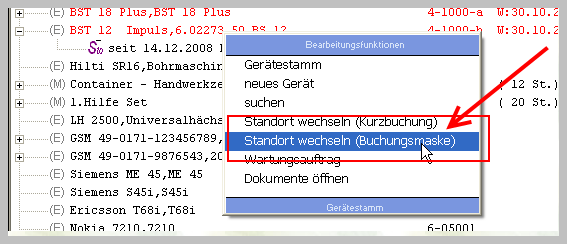 Direkt aus dem Regiezentrum (rechte Maus auf Gerät) heraus können Standortwechsel als Kurzbuchung erfasst werden.