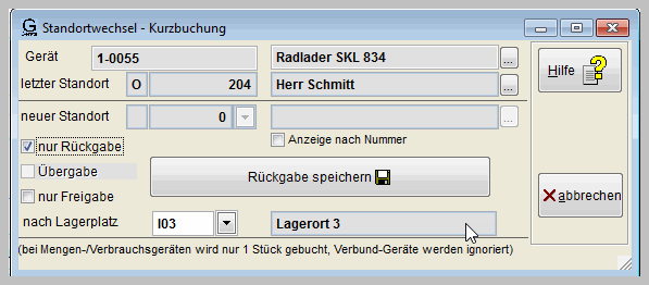 Mit der Option NUR RÜCKGABE wird die vorherige Ausgabe beendet und das Gerät wieder auf das „Lager gebucht“.