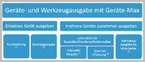 | Werkzeugausgabe an Mitarbeiter 5) | Aufruf über Menü GERÄTE – WERKZEUGAUSGABE |