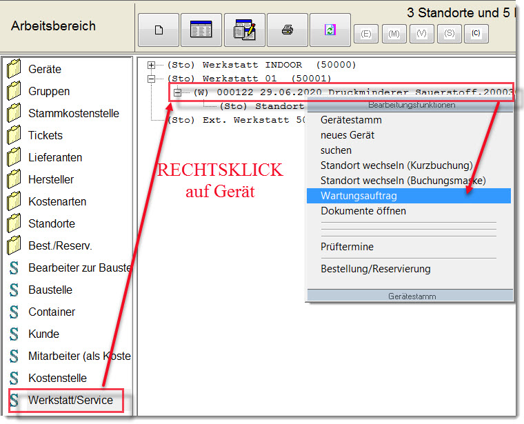 Der Aufruf der Wartungsfunktionen erfolgt über Menü GERÄTE – WARTUNG, über Rechtsklick auf Gerät im Regiezentrum oder über die Scannereingabe „Wartung Beginn“.