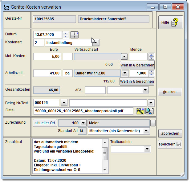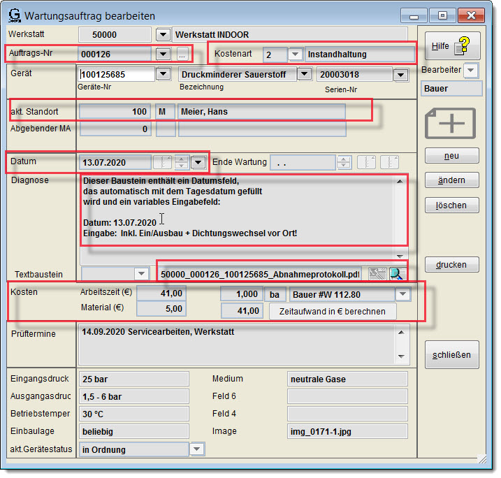 Rot umrahmte Felder werden automatisch in die Geräte-Kosten übernommen!