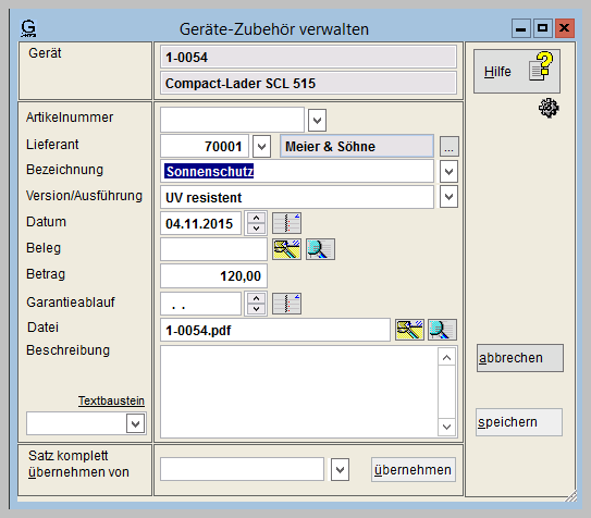 | Es kann eine beliebige Anzahl von Eintragungen pro Gerät vorgenommen werden. Nach den Zusatzfelder kann auch selektiert werden (Standardlisten). Die Datenfelder Bezeichnung, Version, Belegnummer können auch aus einer Auswahlliste entnommen werden. Unter DATEI kann der Name eines Dokuments eingetragen werden, z.B. den Kaufbeleg als PDF-Datei. Bei GERÄTE-MAX kann die Auswahlliste für die Bezeichnung auch unter Menü STAMMDATEN – TABELLEN GERÄTE – ZUBEHÖR verwaltet werden. Bei den anderen Datenfeldern werden die bisherigen Eingaben zur Auswahl angeboten. Zubehör komplett übernehmen vom Hier kann die Nummer eines anderen Geräts angegeben werden, dessen Zubehörliste dann komplett übernommen wird. |