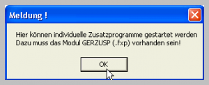 Die Funktionalität des Systems kann um individuelle Programme beliebig erweitert werden. Dabei können beispielsweise zusätzliche Datenbankfunktionen, zusätzliche Auswertungen, Schnittstellen, u.a. realisiert werden. Die Integration in den Standardteil erfolgt an dieser Stelle über ein VFP-Programm*) „GERZUSP“ mit der gewünschten Funktionalität.